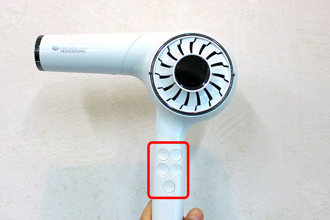 このドライヤーのON OFFのスイッチは、ボタンを押す方式なんです。