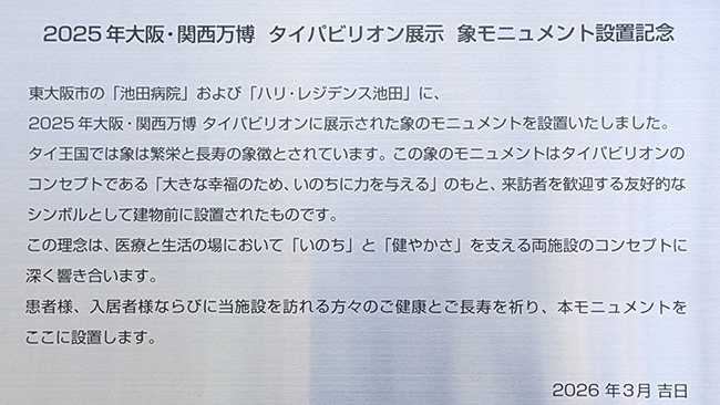 ↑ 案内板によると、タイ王国では象は繁栄と長寿の象徴とされていて、タイパビリオンのコンセプト「大きな幸福のため、いのちに力を与える」のもとに設置されたモニュメントなのだそうです。