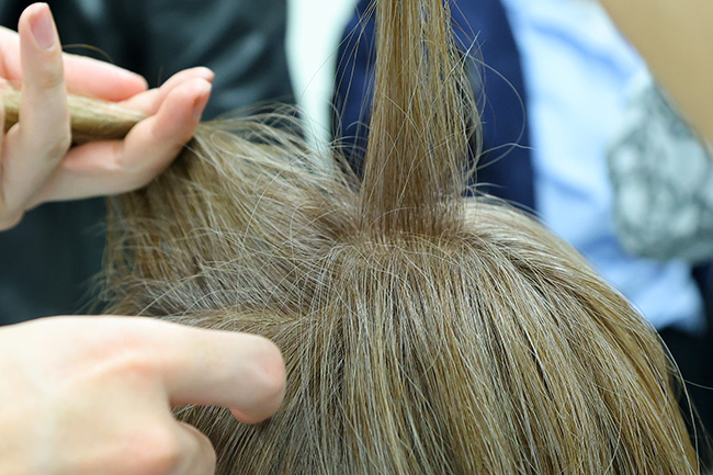 実際にモデルさんの髪を染める工程を見せてもらえる講習でして、染める前の状態が下の写真です。